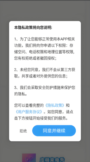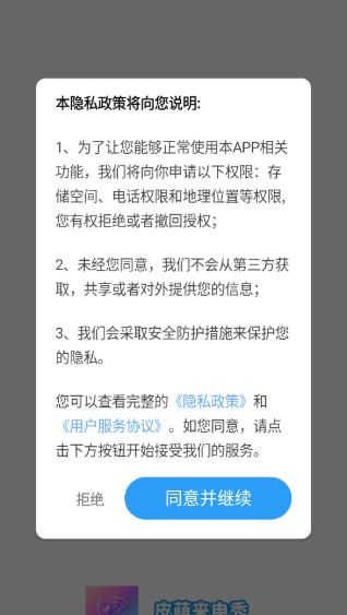 1、下载安装之后打开app,阅读用户隐私协议之后点击“同意并继续”。