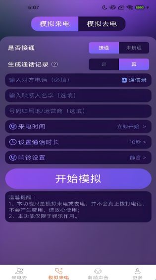 2、模拟来电功能可设置来电显示号码和姓名,用户能自定义来电铃声,还能添加震动效果。