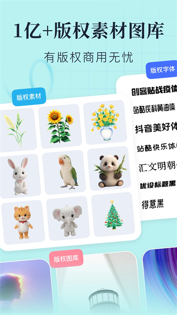 1、模板素材,高清图库:海量资源:30w+精美模板,8000w+高清图片,30w+原创插画及素材,上千款可商用字体无限畅用;精美模板:海报、长图、日签、公众号首图、小红书封面、简历、名片、邀请函,电商海报、手抄报、LOGO、壁纸、头像、朋友圈封面等100+场景。无论是企业营销、微商获客、电商引流、壁纸美化,都能轻松满足需求。