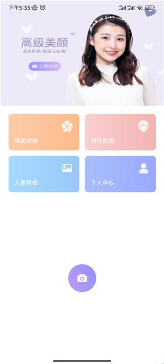 1、下载进入照相机美颜app,软件拥有多种功能,精美滤镜、独特风格、人像精修等;