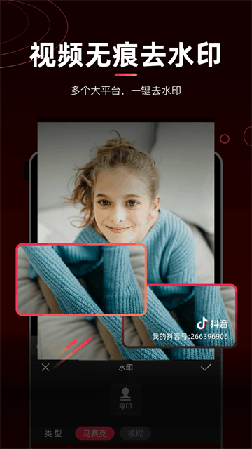 4、去水印的方式可以选择马赛克或者是模糊,选择除印在水印的地方;