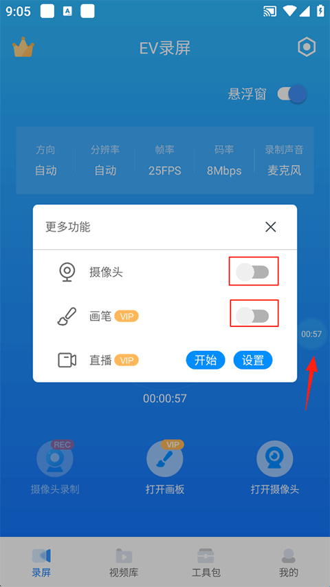 1、打开EV录屏手机版,录制前在首页对视频参数进行调整,开启悬浮窗,点击开始录制;