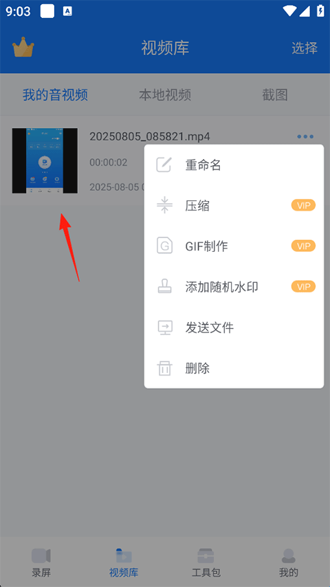 3、录制完成后在视频库查看,点击右侧的扩展按钮可以进行重命名、压缩、GIF制作、添加随机水印、发送文件以及删除视频等操作;