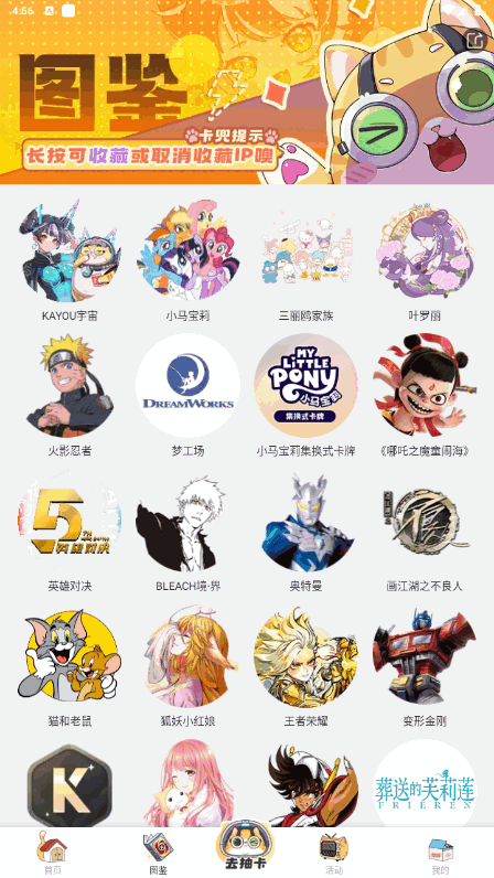 卡游有多种抽卡方式可以选择,小马宝莉、叶罗丽、奥特曼等众多授权正版热门IP卡牌在这里都可以轻松找到,软件会为你提供非常详细的卡片图鉴,各类用户喜爱的IP卡牌及周边来源都是正版,可以放心购买,还有实时推送的集卡得奖、换卡活动、节日活动等特色活动,很多不常见的物料在这里都可以找到,不管是完成任务,使用积分抽卡,还是参与各种趣味活动在这里都可以满足用户的需求,还能制作专属于自己的精美卡册哟。