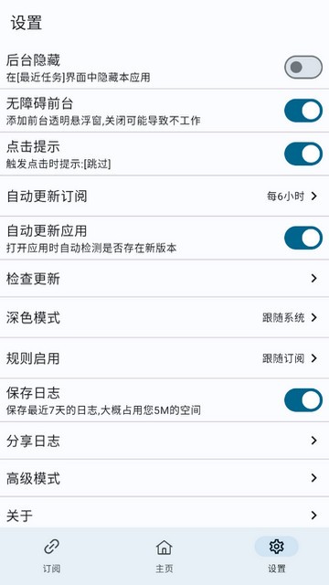 6、点击右下角【设置】按钮,可设置后台隐藏、自动更新订阅、自动更新应用、高级模式等