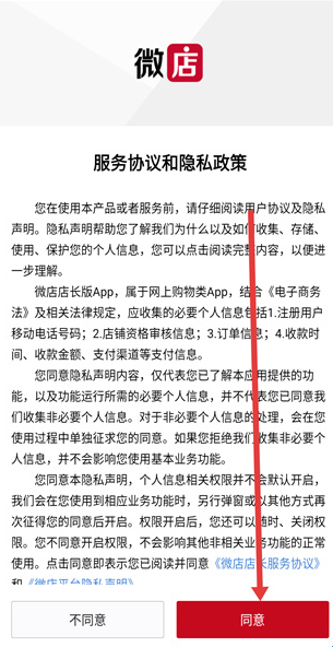 1、打开微店APP,在弹出的服务协议和隐私政策窗口中点击同意,进入应用功能展示页面。