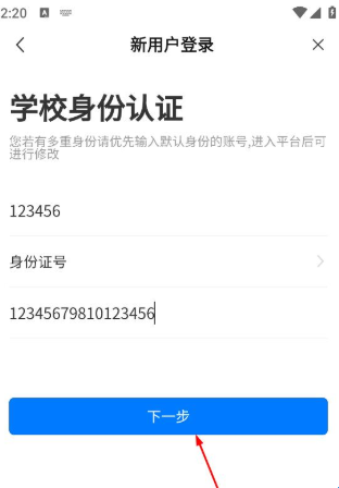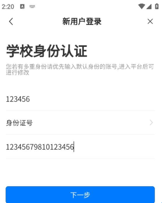 3、在学校身份认证页面,依次输入工号或学号,以及身份证号等证件号。