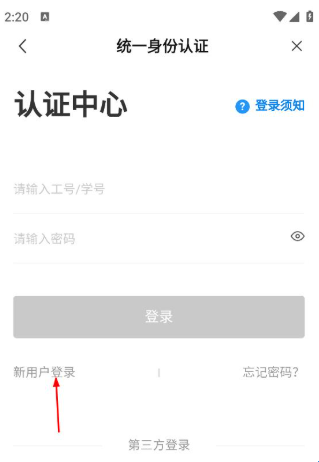 2、在统一身份认证页面,点击“新用户登录”选项,进入学校身份认证页面。