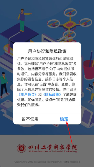 1、打开四川工业科技学院APP,进入用户协议和隐私政策页面,仔细阅读相关内容后,点击“确定”按钮,进入统一身份认证页面。