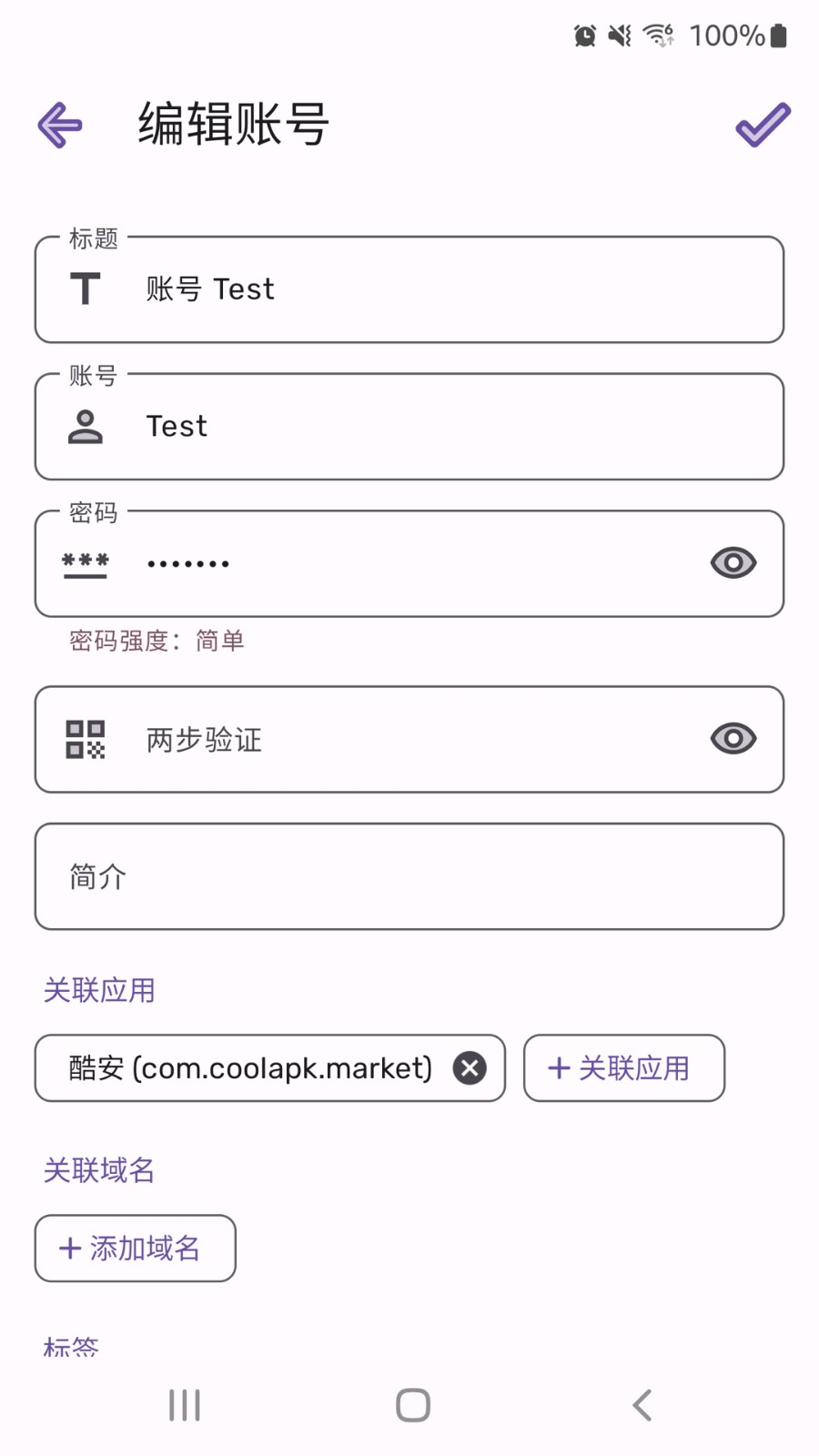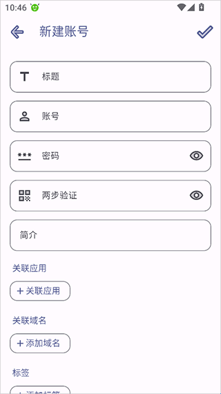 3、接着新建账号和密码时将关联的应用、网站域名等进行设置即可