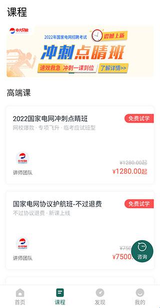 4、切换到【课程】页面可以查看软件内所提供的一些专业课程,右下角还有专门的咨询入口。