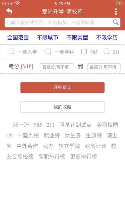 * 高校查询:按热门区域、按省份、按城市、按高校类型、按学历、按双一流、按985、211、按关键词,按考分范围、按学校名人、按双一流学科、按双高计划、按双高计划专业群等众多方式查询高校