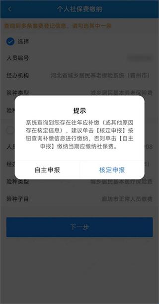 4、如果界面提示有核定信息未缴费,说明社保部门或医保部门为该用户已核定应缴费数据,选择提示框的“核定申报”按钮进入“城乡养老核定申报或城乡医疗保险核定申报”界面;如果选择提示框的“自主申报”则进入“城乡养老自主申报或城乡医疗自主申报”界面,如果没有核定信息系统将自动跳转到自主申报页面;