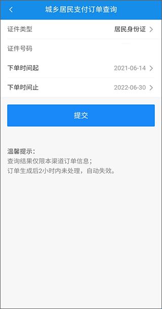 5、除此之外,城乡居民用户还可以查询支付订单,缴费人通过河北税务APP缴纳社保费后,通过此功能可以查询订单记录,输入证件号码,下单时间,单击“提交”按钮。
