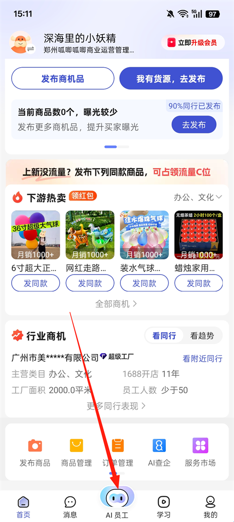 1、打开1688商家版App,登录之后,点击【AI员工】。
