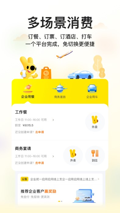 依托美团海量商家资源,全面覆盖用餐、差旅、用车、福利发放等企业消费场景。