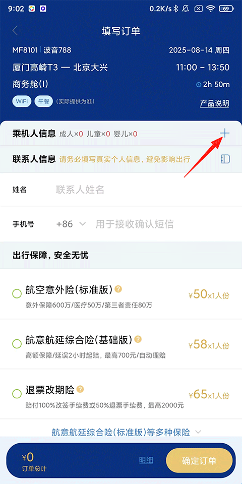3、进入填写订单页面后点击【乘机人信息】右侧的【+】按钮。