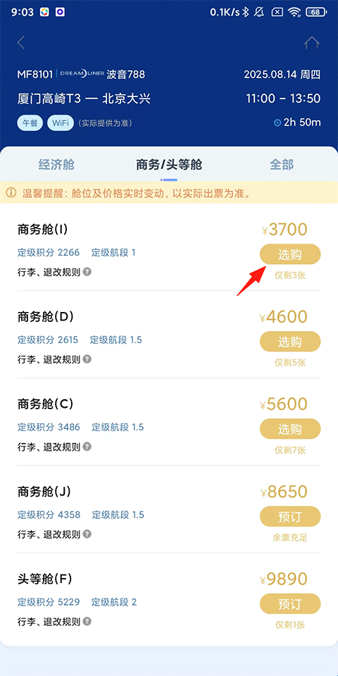 2、根据需求选择航班、舱位等,点击【选购】。