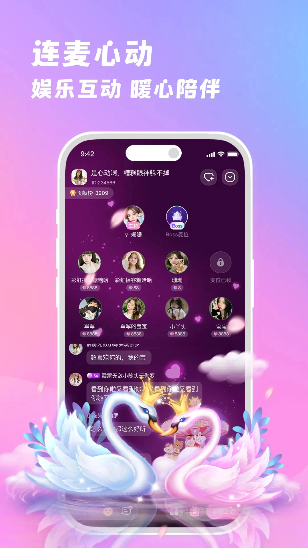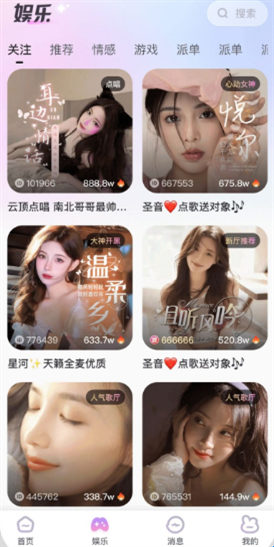 3、K歌音乐互动:内置丰富曲库与精准音轨,用户可与宝藏歌手进行对唱、点歌送礼、声音PK等操作,体验类似直播舞台的表演乐趣。