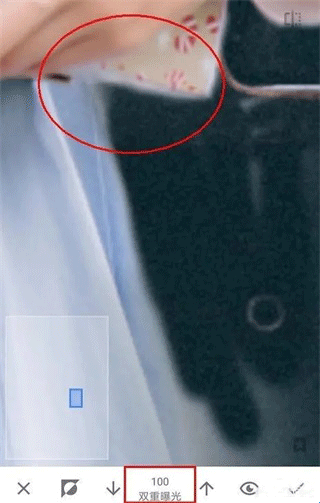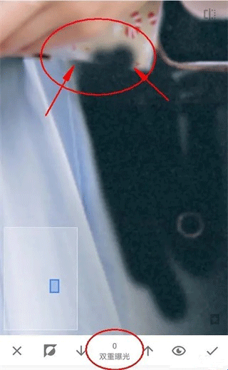 10、在我们涂抹人物边缘轮廓时,可以大拇指和食指在图片上进行扩张,图片就可以放到最大方便我们处理了。但是如下图:即使将图片放到最大时,人物小轮廓处手指同样太大了,无法进行精确涂抹。这里给出的建议是先用双重曝光0的数值去不显示一些内容。