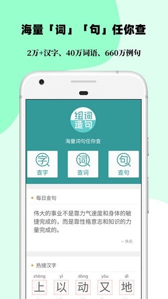 4、组词造句大全app便是一个查找词语和造句的利器,其收录了2万+汉字,45万+组词,664万+例句,只有想不到,没有搜不到,而且完全免费,同时也是一个帮助家长辅导孩子的助学神器。