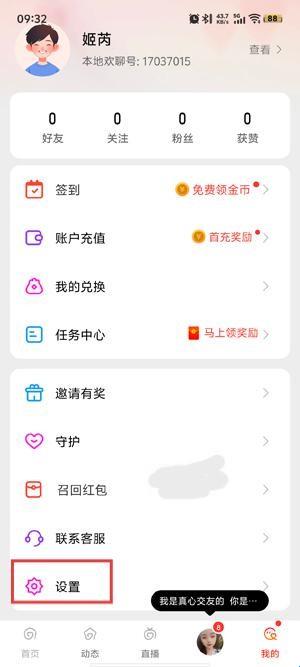 1、打开你的本地欢聊App,在个人中心点击设置功能。