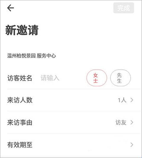 3、开始邀请创建,输入访客的姓名,然后输入访客人数和来访事由,在选择时间,点击右上角的完成即可。如果访客还有开车的话,输入车牌号,到时候车闸识别车牌号就会自动打开了。