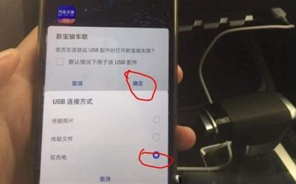 2、打开手机上的新宝骏APP,用数据线连接手机和车机,勾选“默认情况下用于该USB配件”的方框,并点击“确定”,后续弹出的USB连接方式提示框中,选择仅充电。