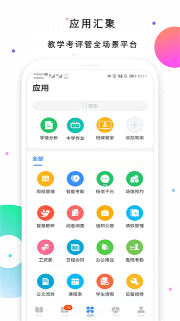 1、面向学校管理者:对接开放式应用商店,整合内部应用及第三方应用,汇聚家校沟通、办公管理、在线学习、数字资源、教务教学等丰富的教育轻应用,协助学校建设统一平台门户,实现校园沟通、办公、教学、安全等各种业务需求。