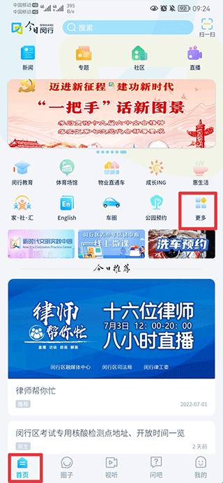 1、打开今日闵行app最新版,在首页中点击更多。