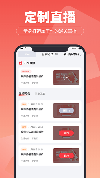 在线直播课堂是一款专注学历职业教学培训的APP,从事培训多年的网红老师,致力教你快速通过证书考试。【产品简介】学历提升、二级建造师、初级会计师、教师资格证、证券从业资格证、yin行从业资格证、期货从业资格证、从业资格证、在职研究生、人力资源师和心理咨询师等,在线直播课堂,培训学习!