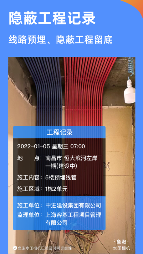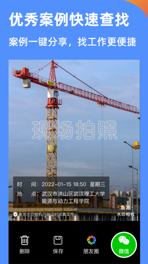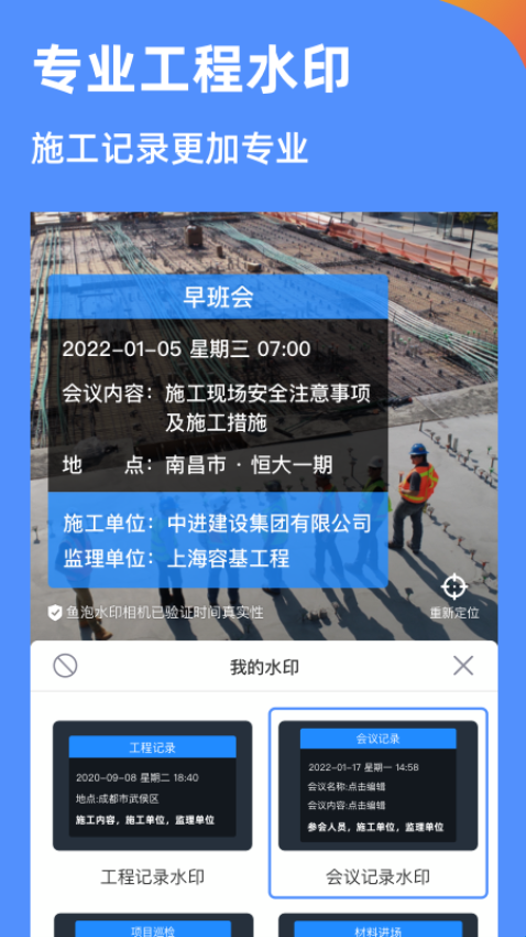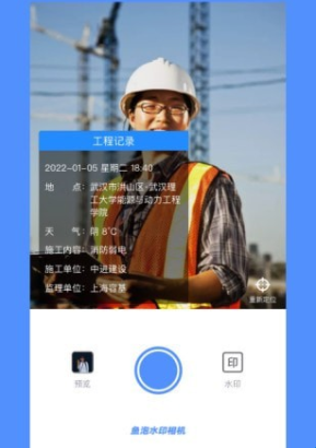 1、工程建筑,工地施工外勤人员工作汇报专用相机,照片无法作假,时间无法修改,外勤人员工作真实现场考勤拍照水印相机。