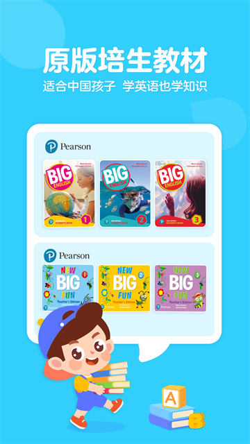 4、培生原版教材:引进培生 Big Fun&Big English第二版,课程遵循孩子语言学习规律,学英语同时融入学科知识、综合提高语言能力。