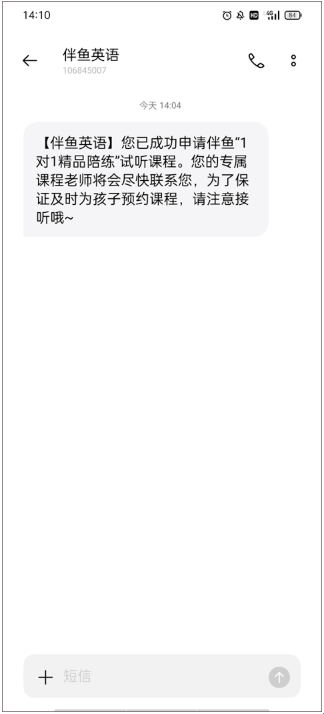 4、等待一会儿之后,伴鱼少儿英语app官方就会发来短信通知你已经领取成功啦,只要添加老师联系方式即可享受相应的课程服务。
