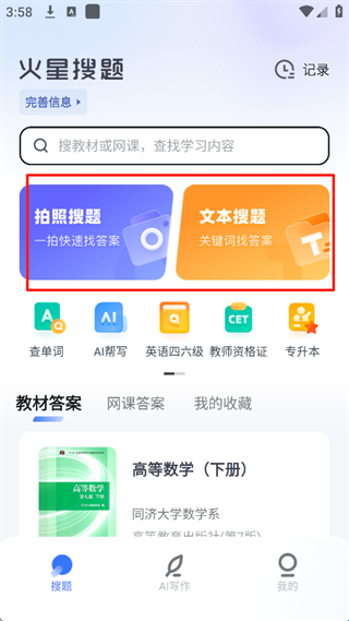 1、在本站下载安装并打开火星搜题App,进入首界面,可以看到题库非常丰富。