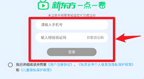 1、打开新东方一点一看app后,输入手机号并获取验证码,完成登录或注册操作。