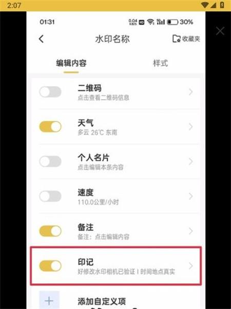 5、我们返回水印名称界面,找到“印记”并点击进入。