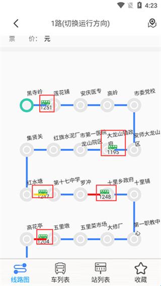 在线路图中可以看到绿色的公交车图标,这便是公交车的位置。