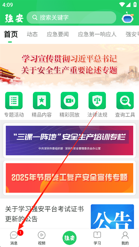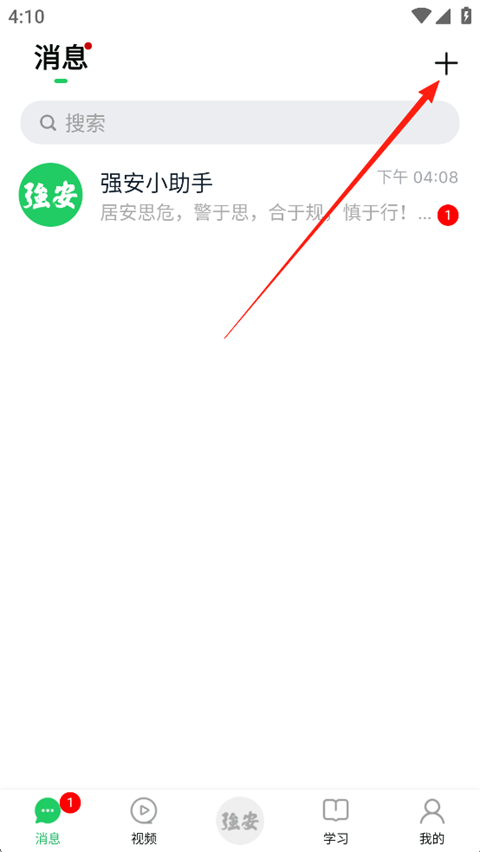 1、打开学习强安App,登录之后,点击【消息】。