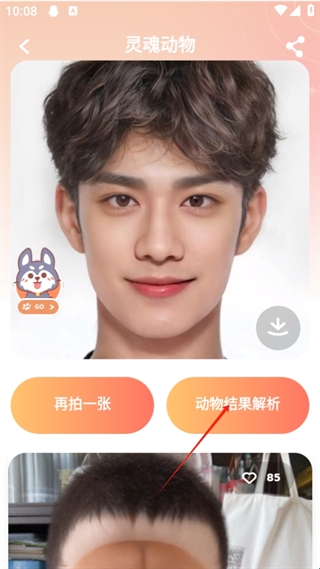 3、拍摄完成之后系统将自动辨别以及更改形象,使得照片转变为具有个人特色的小动物,如果想要保存可以点击右下角的下载处;