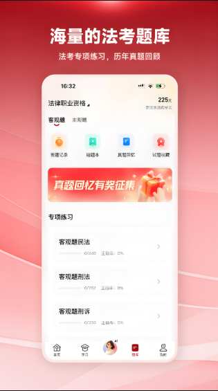 1、题库资料:各科题库、历年真题、练习室、错题本、公告栏。