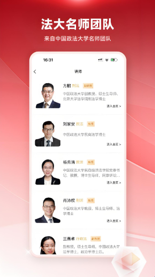 3、名师在线授课:中国政法大学副教授、教授级别的学者讲师,刘家安、杨秀清、方鹏、兰燕卓等多位名师优质直播课程带你轻松过法考。