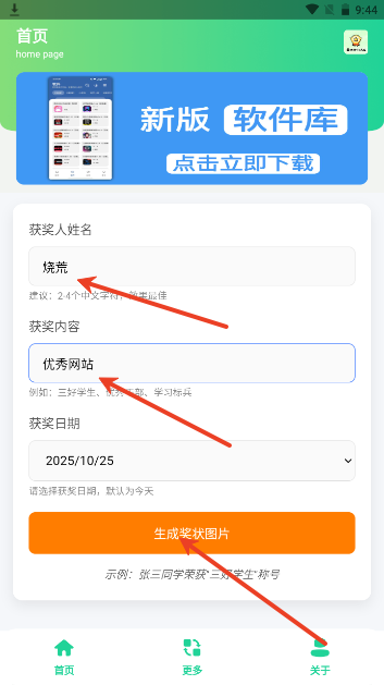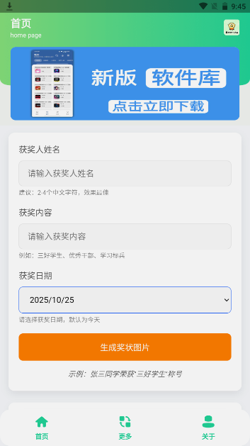奖状图生成器是一款可以免费生成奖状图的软件,支持自定义名字、获奖内容、获奖日期即可生成,操作非常简单,并且该软件是完全免费的,同时软件内还提供丰富的福利资源等你获取,内容多多,快来下载体验吧!