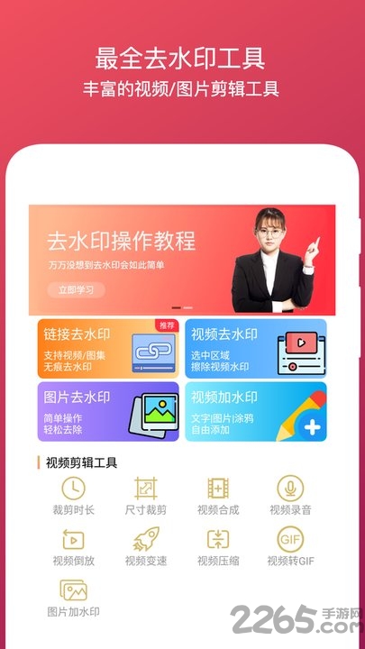 去水印全能王app是一款超棒的去水印软件。简单方便的超级实用去水印工具!完美的剪辑添加水印,多种图片内容覆盖删除,超级实用的功能,速度超棒!你还在等什么?快来2265安卓网下载吧!