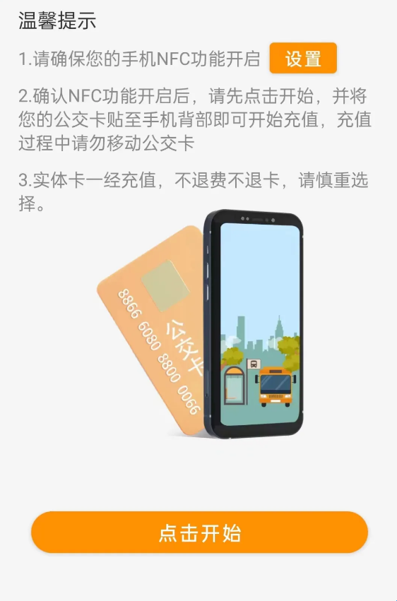 用户根据温馨提示,先“点击开始”,并将要充值的公交卡贴至手机背部即可开始读卡,读卡过程中请勿移动公交卡。