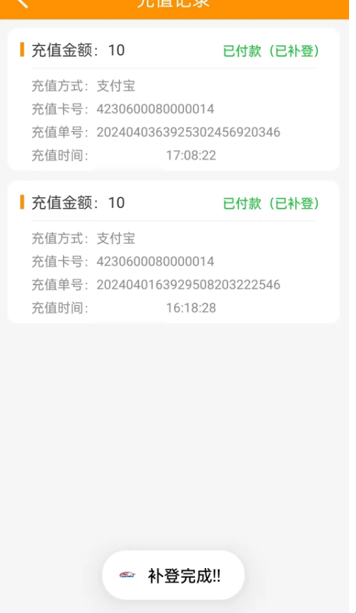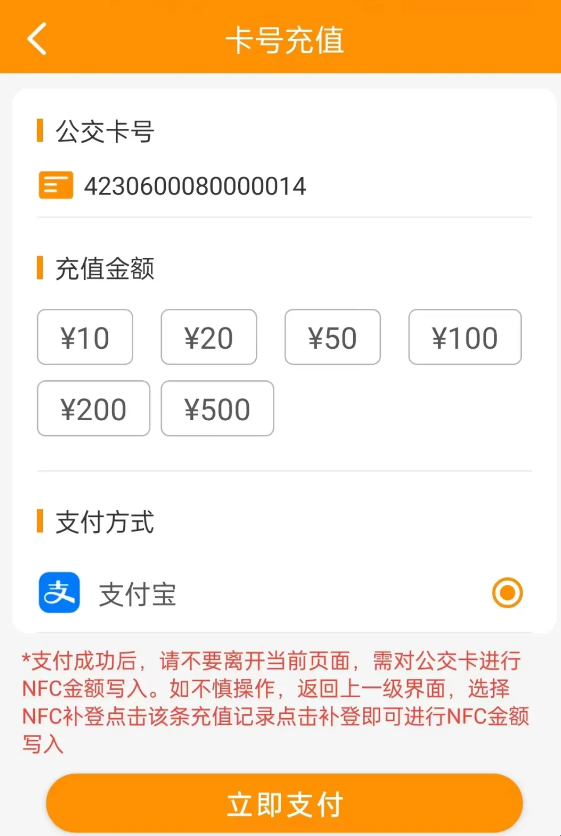 支付完成后请勿退出,自动进入写卡操作,用户请先将公交卡移开手机背部后“点击开始写入金额”,再将公交卡贴至手机背部即可开始写卡,写卡过程中请勿移动公交卡,直至出现“补登完成”字样,即写卡成功。