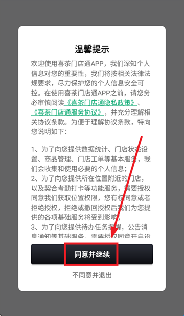 1、打开喜茶门店通app,在温馨提示界面点击同意并继续。