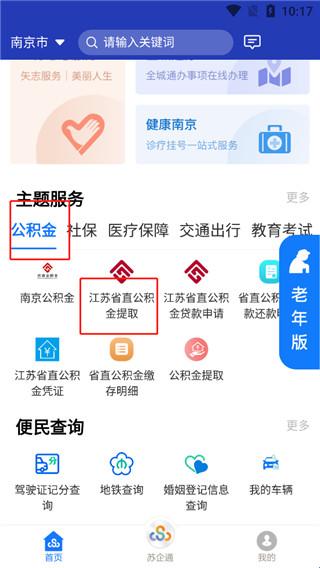 2、没有找到养老金的话,直接往下滑动,我们可以看到主题服务,点击公积金中的江苏省直公积金提取。