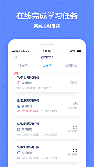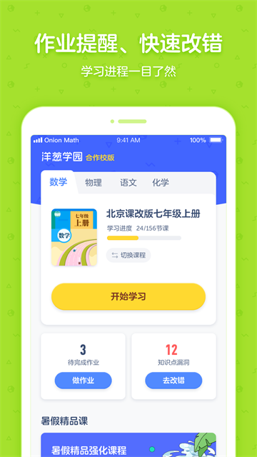 洋葱学院合作校版是一款教育资源app,洋葱学院接入国家教育资源公共服务软件,教材课本覆盖小学、初中、高中所有科目,为学生提供电子课本点读、视频课程直播服务。学生可以在线完成作业,设置作业提醒再也不怕忘记。家长也可以登录app查看学生的学习进度,老师也可以根据学情反馈来调整教学方案。app里面还有许多的优质课程,名师在线指导。