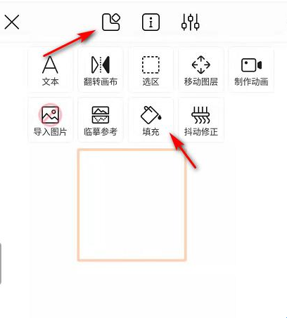 3、然后点击顶端工具栏中最左侧的图标,如下图所示。在弹出列表中选择“填充”,如下图所示。